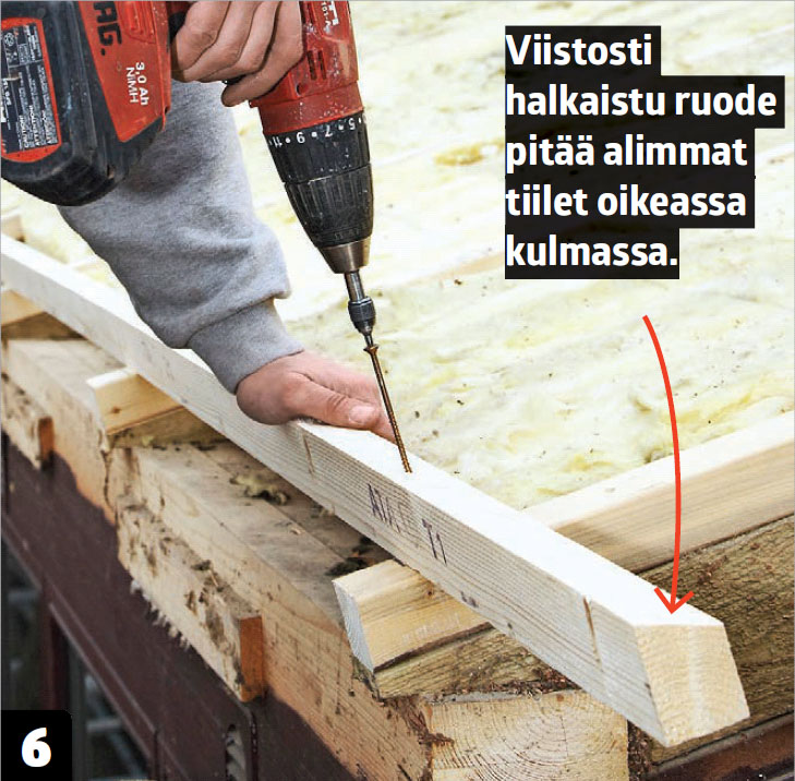 Ruuvaa halkaistu ruode kattoristikoihin. Ruuvaa ruode mahdollisimman lähelle räystästä. Nyt voit asentaa aluskatelevyt räystäälle.