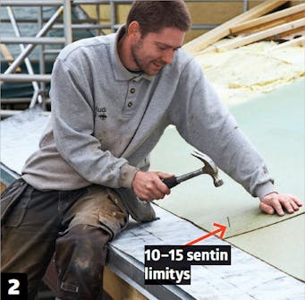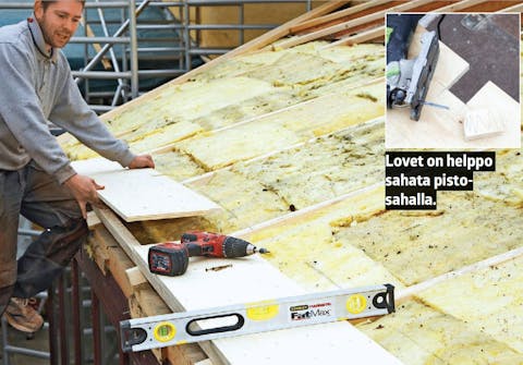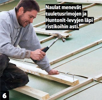 Asenna seuraava levy 10-15 senttiä edellisen päälle ja naulaa se kiinni parilla naulalla. Naulojen pitää osua alla olevaan ristikkoon.