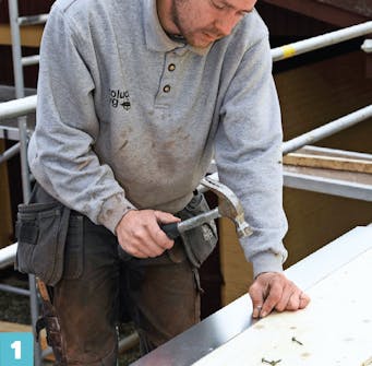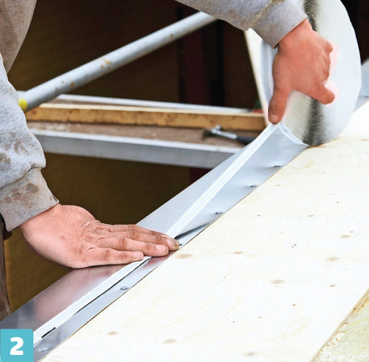 Naulaa räystäspelti kiinni alumiini nauloilla. Asenna pelti niin kauas, että sen alle jää tilaa otsalaudalle ja kourukoukuille. Tässä räystäspelti asennetaan 45 millin päähän levyn reunasta.