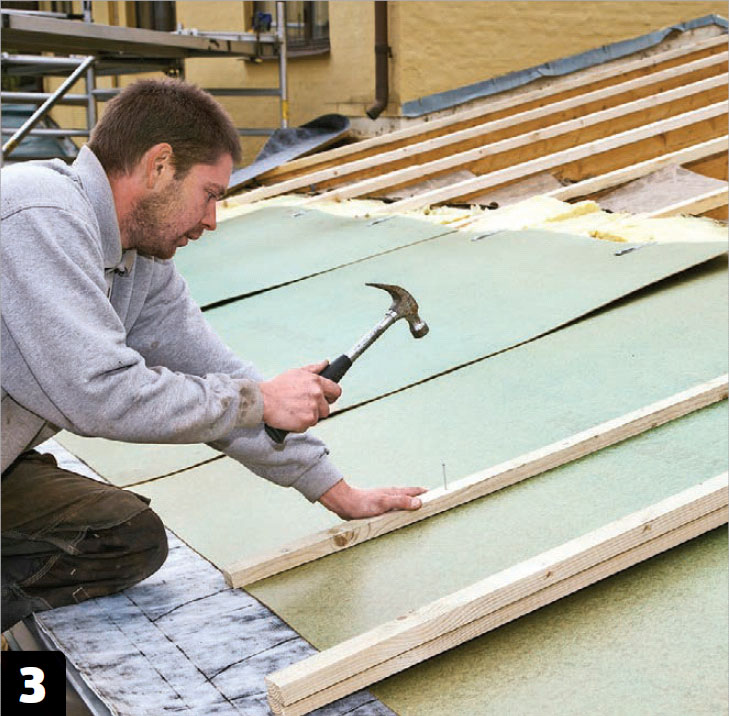 Ruuvaa räystäslevyt kiinni. Käytä 25 millin vaneria ja tee siitä 30 senttiä leveitä palasia. Sahaa levyihin lovet, jotta levyt eivät nouse ristikoiden päälle ja kerää kosteutta.