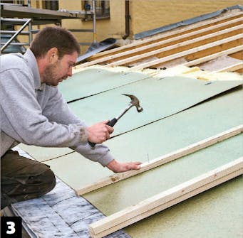 Kiinnitä rimoihin väliaikaisesti pari ruodetta. Niitä ei tarvitse asentaa tarkasti, sillä ruoteita tarvitaan vain katolla liikkumiseen.