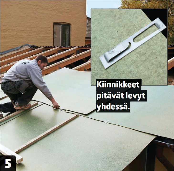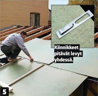 Asenna seuraavan rivin levyt ja kiinnitä ne alempiin levyihin Huntonit-kiinnikkeillä. Levyt limittyvät noin 10 senttiä. Kiinnikkeet pitävät levyt tiiviisti ristikoita vasten ja tuiskuavan lumen pois rakenteista.