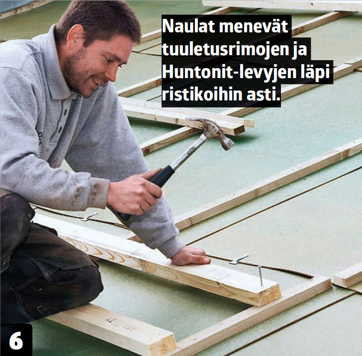 Seuraavaksi katolle asennetaan Huntonit-levyt. Ne on tehty puristetusta ja kyllästetystä puukuidusta, jotka johtavat ulkoa päin tulevan veden pois ja imevät sisältä päin tulevaa kosteutta. Levyt limittyvät ja johtavat veden räystäälle ja räystäspellin kautta räys-täskouruun. Levyt vakauttavat katon rakenteen, sillä ne naulataan kiinni ristikoihin.