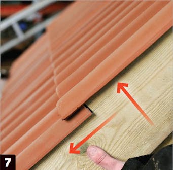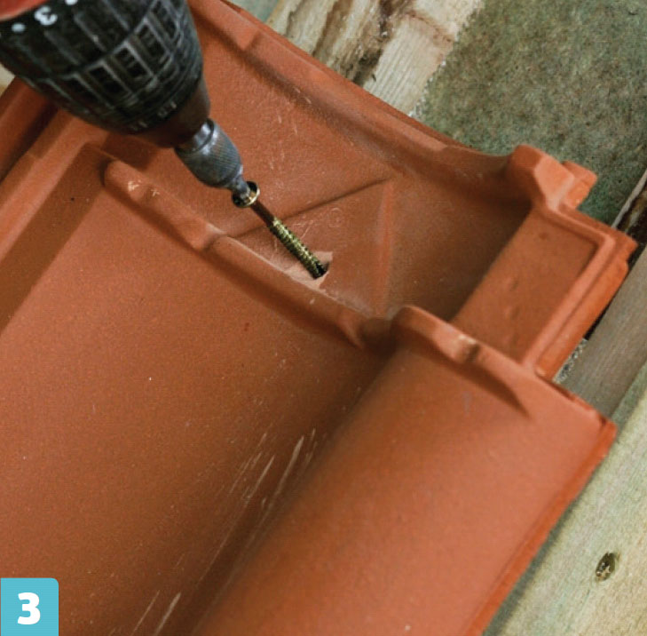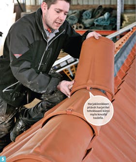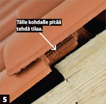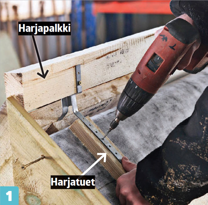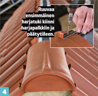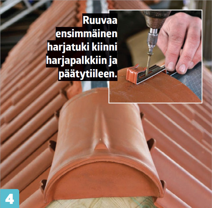 Kiinnitä päätyharjatiili ja ruuvaa se kiinni harjatukeen. Kiinnitä rauta myös harja ruoteeseen ja asenna loput harjatiilet.