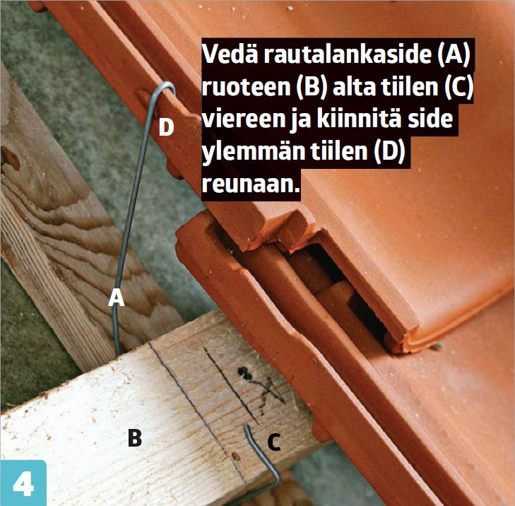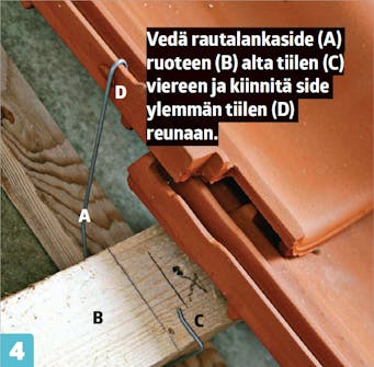 Asenna aluksi reunimmaiset tiilet. Ruuvaa otsalautojen viereiset tiilet kiinni ruoteisiin, jotta ne pysyvät varmasti kiinni kovalla tuulella.