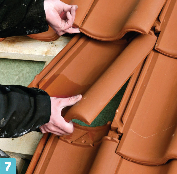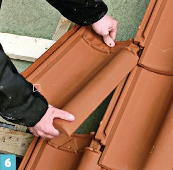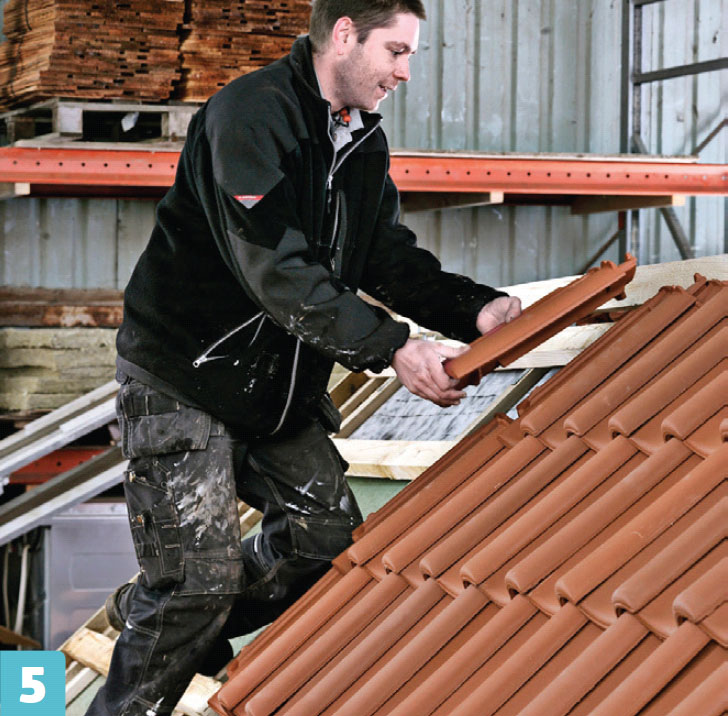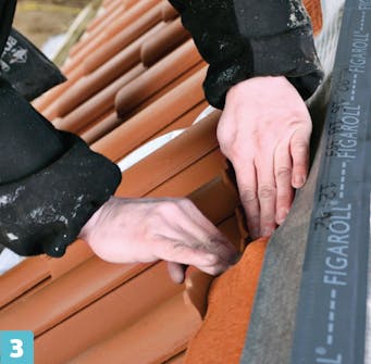 Asenna harjatiilet siinä vaiheessa, kun olet asentanut kolme ylintä tiiliriviä, jotta voit seistä tukevasti ruoteiden päällä. Harjapalkki on jo asennettu. Sen jälkeen pitää asentaa tiiviste, joka huolehtii harjan tuuletuksesta ja pitää tuiskuavan lumen pois aluskatteesta. Kun tiiviste on paikallaan, voit asentaa harjatiilet.