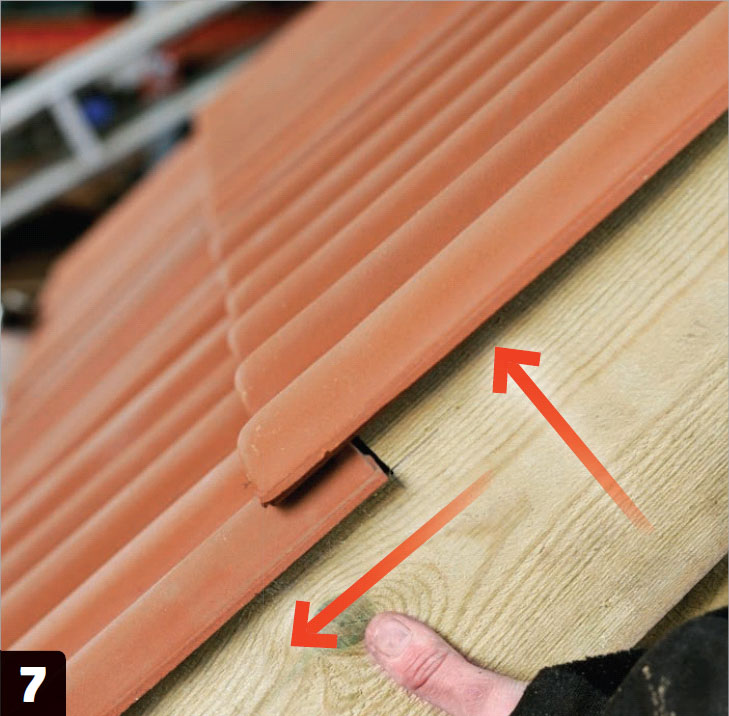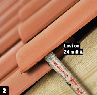 Harjatiilet eivät välttämättä sovi katon mittaan. Voit säätää harjatukien paikkaa 3-4 senttiä, jotta saat harjatiilet mahtumaan paikalleen kokonaisina. Säätövara riittää, jos katto on pitempi kuin 650 senttiä. Matkalle mahtuu 14-15 harjatiiltä. Harjatiilten jälkeen voit asentaa loput tiilet katon keskelle.