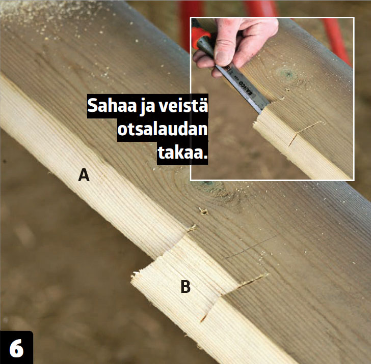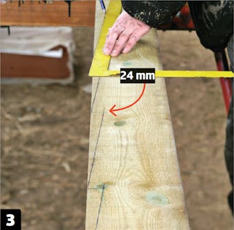 Piirrä lovien kohdat. Nosta otsalauta maahan ja piirrä lovet tarkasti. Jokainen lovi on 24 milliä syvä.