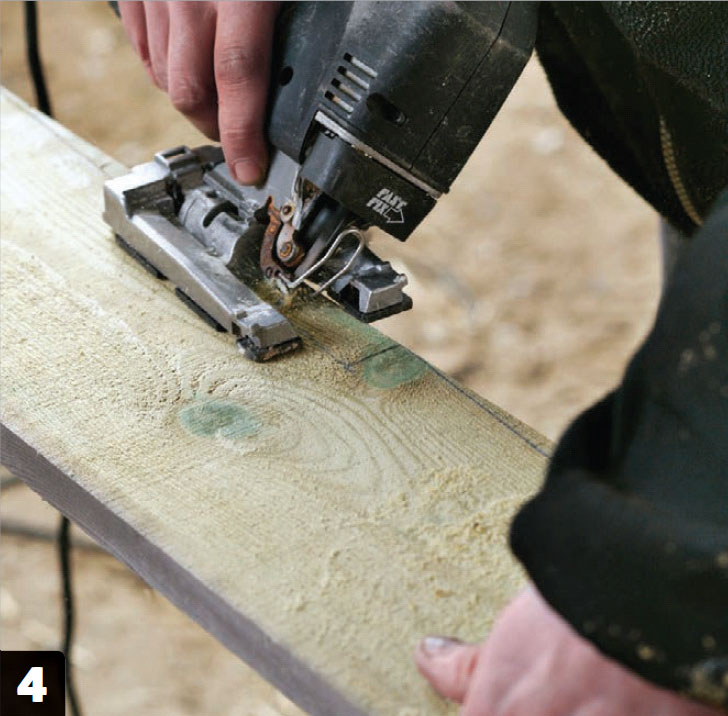 Sahaa lovet. Säädä pistosaha 45 asteen kulmaan, jotta otsalaudan takareuna ei osu tiiliin, ja sahaa lovet.