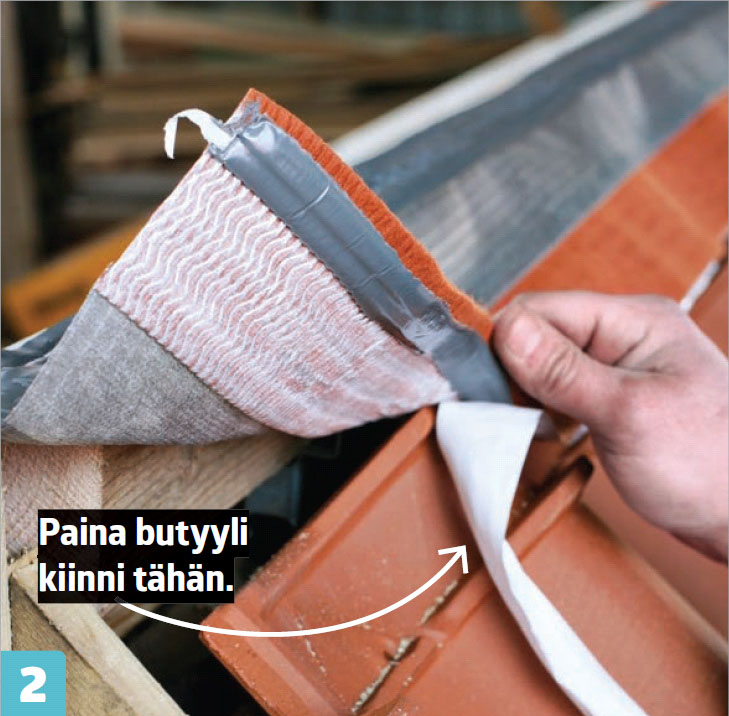 Irrota taustapaperi ja paina butyylinauha kiinni ylimpiin tiiliin. Butyylinauha on hyvin tahmaista, eikä se irtoa ajan kuluessa.