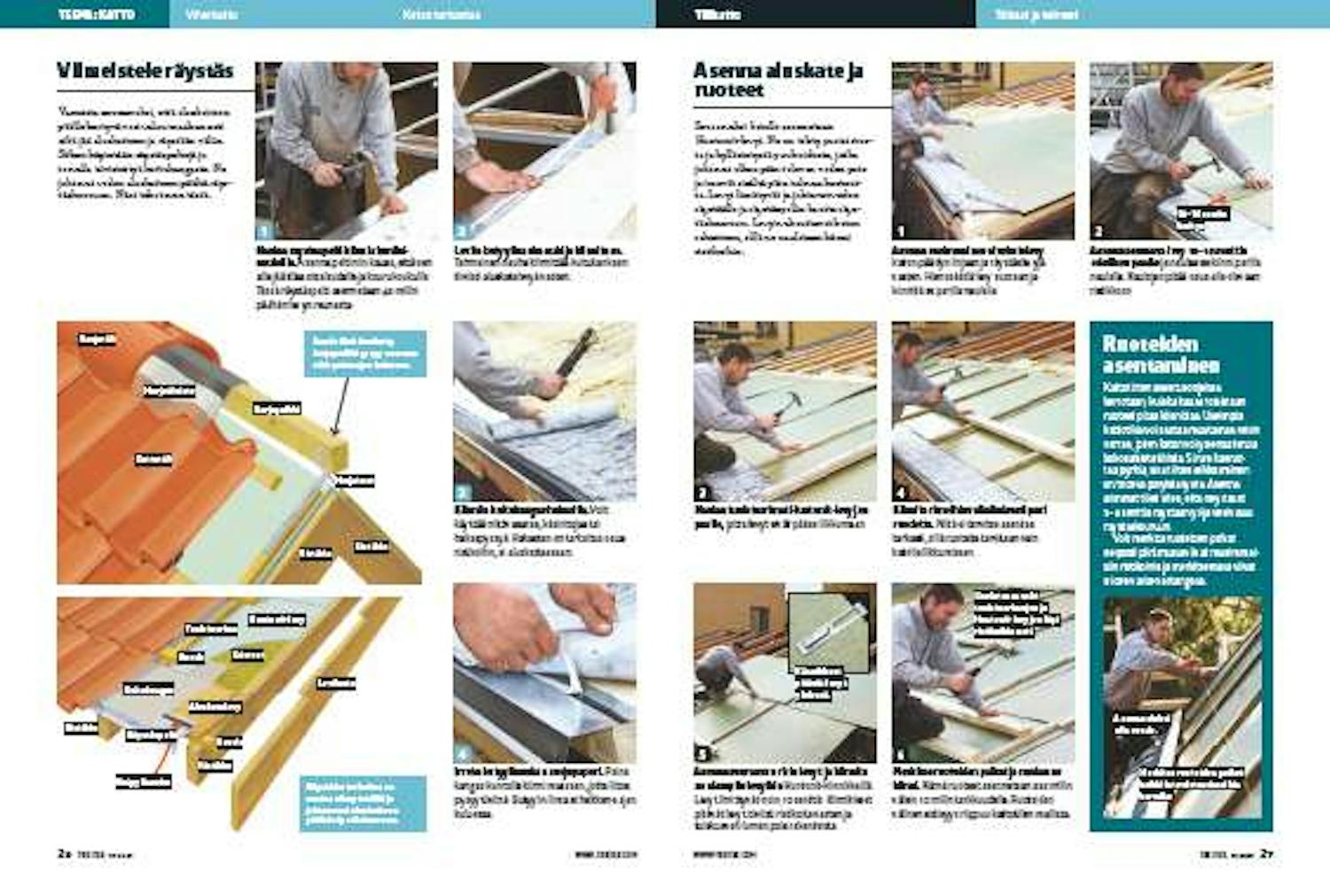 Varmista seuraavaksi, että aluskatteen päälle kertyvä vesi valuu maahan asti eikä jää aluskatteen ja räystään väliin. Siihen käytetään räystäspeltejä ja tervalla tiivistettyä kuitukangasta. Ne johtavat veden aluskatteen päältä räys-täskouruun. Näet tekotavan tästä.