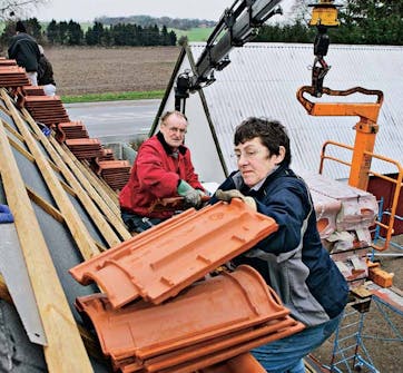 Nosturista on hyötyä nostettaessa raskaita kattotiiliä katolle. Vaihtoehtona olisi rankkaa työtä, mutta tehokasta hyötyliikuntaa.