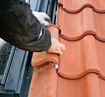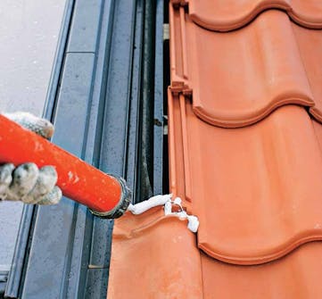 Kattoikkunoiden ja savupiipun ympärille leikatut tiilet liimataan paikalleen. Liimaukseen käytetään eri-tyisesti kattotiilien liimaukseen tarkoitettua liimaa (tässä Dana Lim Kattotiililiima 525).