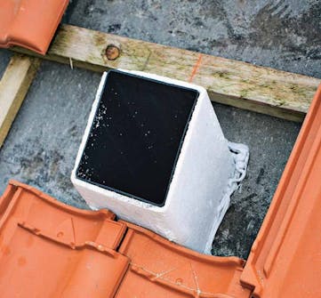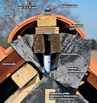 Kestomuovieristetty neliönmuo- toinen putki johdetaan vesikatteen pohjarakenteen läpi ja kiinnitetään ala- puolelta. Yläpuolelta se tiivistetään silikoni-saumauslaastilla.