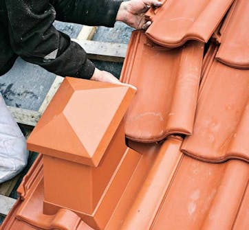 Pvc-muovista valmistettu tuuletuspiippu on hieman edullisempi kuin vastaava posliininen, joten tässä kohtaa päätettiin säästää. Piippu ostettiin yhdessä kattotiilien kanssa.