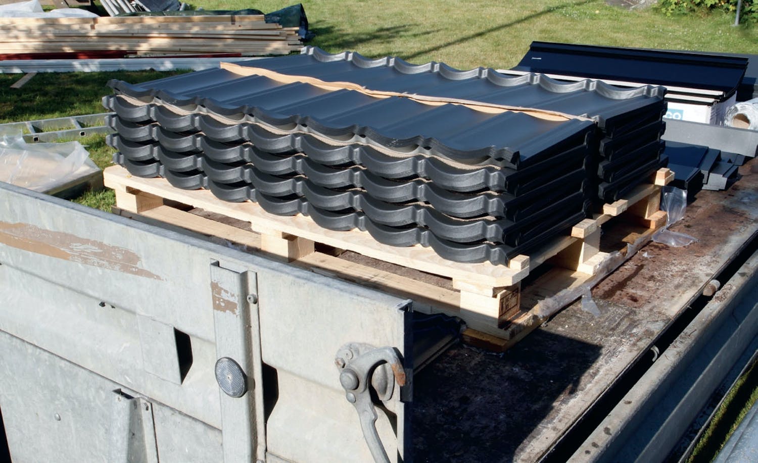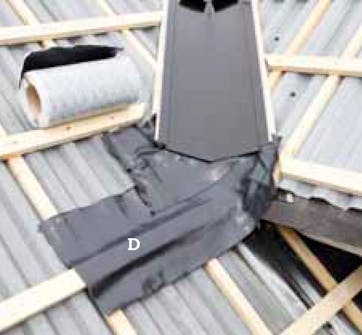 Aloita alhaalta ja naulaa jokainen peltiprofiili kiinni yläreunastaan - seu-raava profiili asetetaan edellisen päälle limittäin. Jos sisätaitteen pelti johtaa veden katolle vesikourun sijaan, taite on tiivistettävä itseliimautuvalla bitumikankaalla - tässä kohteessa käytetään Waka-Flex-katetta.