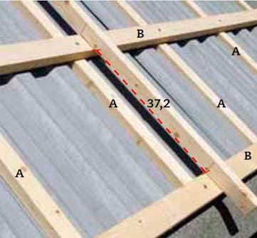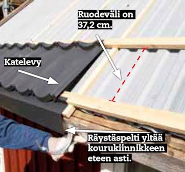 Jos tilaa on, katolle asennetaan pysty-rimat. Esimerkissä rimat asennetaan poimulevyjen uomiin, jolloin aluskaton ja vesikaton välinen etäisyys ei kasva liian korkeaksi. Jotta vaakaruoteiden väliset etäisyydet pysyisivät yhdenmu-kaisina, ruoteiden asennusta varten työstetään pari mittakeppia. Ruode-väliksi tulee 37,2 cm.