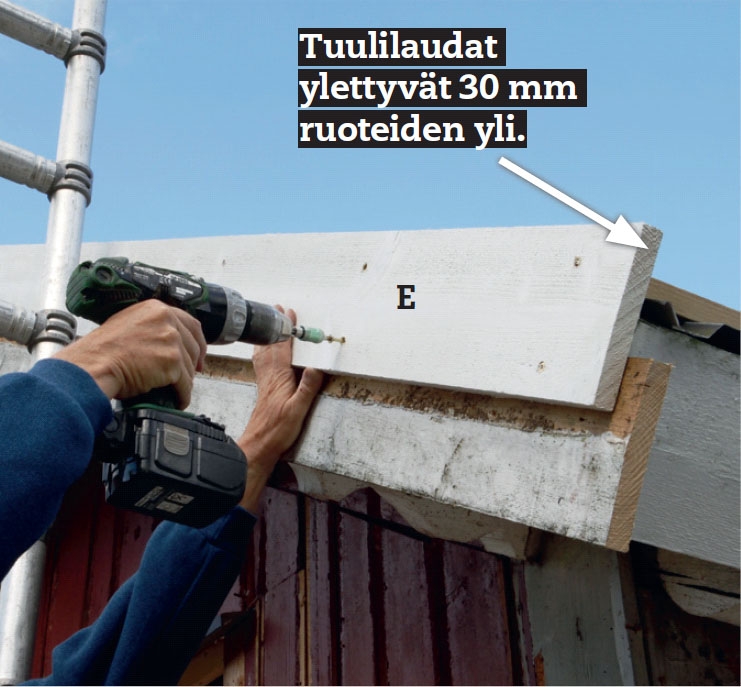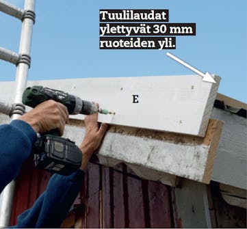 Koska kattoa on korotettu katelevy-jen paksuuden verran ja etäisyys aluskatosta on kasvanut, päätyihin joudutaan kiinnittämään ylimääräiset tuulilaudat (E). Ne kannattaa maalata jo etukäteen.