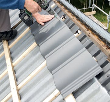 Kiinnitä rimat (a) 30 cm välein poimuihin ilman näkyville jääviä ruuveja. Kiinnitä ne 4,5 x 70 mm kattoruuveilla poimulevyjen läpi niiden alla oleviin vanhoihin ruoteisiin asti.