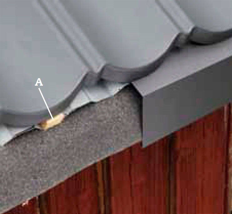 Alareunassa räystäspelti työntyy alimman katelevyrivin alta ja se naulataan kiinni tuuletusrimoihin (A), kun alin levy naulataan paikalleen. Huomaa, miten hyvin huopakaistale yltää aivan räystäspellin alareunaan asti.
