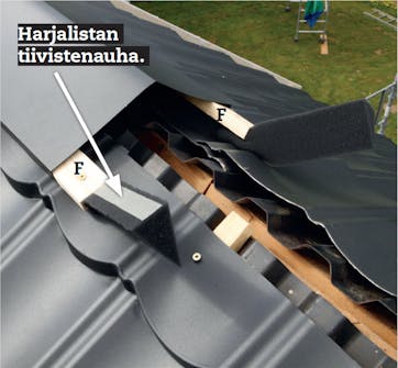 Ruuvaa kaksi 19 x 50 mm harjalistaa (F) tiivisteineen paikalleen, kun toinen kattolape on valmis, ja olet asentanut kaksi ylintä katelevyriviä toiselle puolelle. Tämän jälkeen harja ruuvataan kiinni.