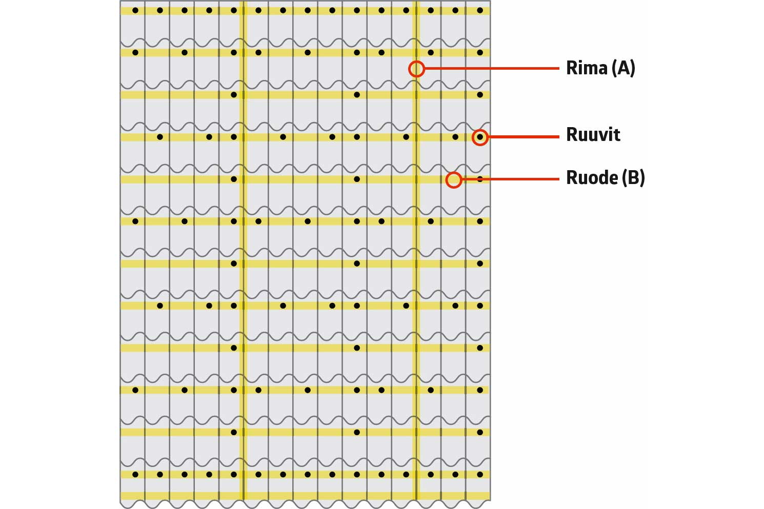 Asenna räystäältä harjalle yltävät rimat (A) noin metrin välein. Ruuvaa rimojen alapäät kiinni vanhoihin ruoteisiin yhdellä 6x120 millin ruuvilla.