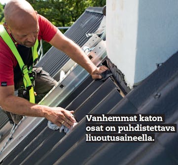 Puhdista huolellisesti. Kattolevyt on pestävä, jotta tiiviste tarttuu niihin (kuvassa maalattu kuitusementti). Kuvan katto on uusi, joten riittää, että harjaamme sen ja kuivaamme kostealla liinalla.