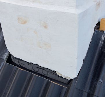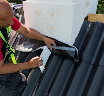 Kiinnitä kaistale piipun ja katon saumakohtaan. Kun tiiviste on kiinnitetty, voit repiä pois kalvon ylimmän osan. Paina nyt tiiviste yläosan päälle. Pidä kaistaleen tarttuvaa reunaa irti katos ta, kunnes olet valmis kiinnittämään sen.