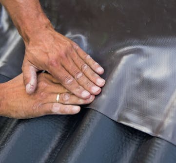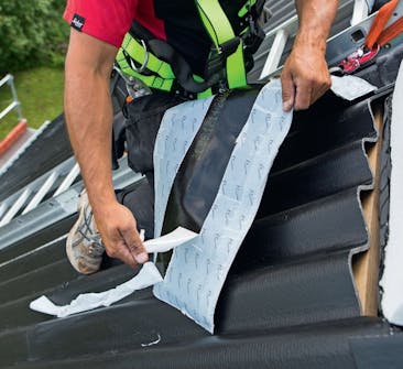 Liimaa alin osa kiinni ja paina tiiviste varovasti kattolevyjen poimu jen päälle. Älä paina poimuja, kiinnitä vain materiaali poimujen harjaan.