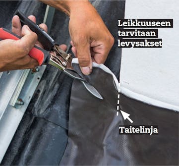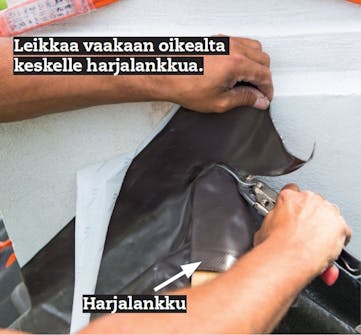 Tehtävä on helpompi kuin se ensi al-kuun kuulostaa: aseta tiiviste harjalle, mutta älä poista suojakalvoa, ja katso, millaisia linjoja muodostuu, kun varo-vasti työnnät tiivistettä paikalleen. Tii-viste leikataan myöhemmin juuri näitä linjoja pitkin peltisaksilla.