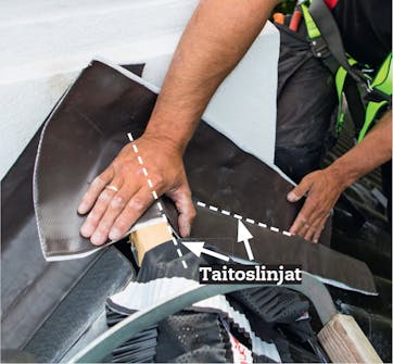 Tee seuraavaan kappaleen taitos-linja toiselle sivulle. Aseta se niin, että sen alareuna myötäilee vaakatiivisteen alareunaa. Muotoile tiiviste katon mukaan. Sitä ei taiteta ylhäältä, ennen kuin kappale on leikattu.