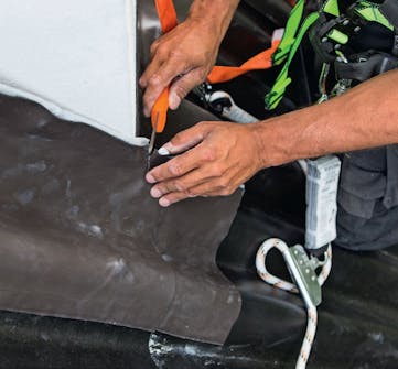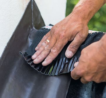 Wakaflexin alumiinisen verkkoytimen ympärille on laminoitu viisi kerrosta. Materiaalin alapinnassa on tehokkaasti kiinnittyvät butyylikaistaleet. Tämän vuoksi tiivisteen suojakalvoa ei pidä poistaa yhdellä kertaa, vaan vähän ker-rallaan, kuten kuvissa näytämme. Muussa tapauksessa kalvo kiinnittyy kaikkeen, etkä pysty enää itse määritte-lemään työskentelytahtiasi.