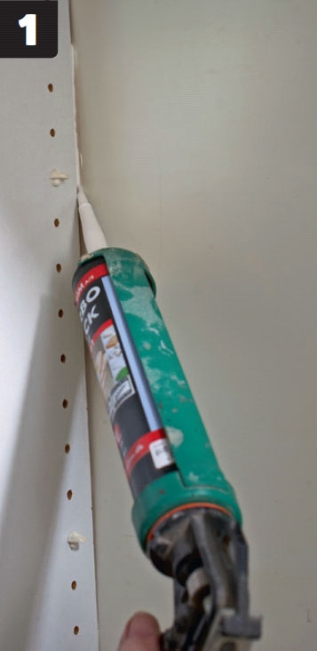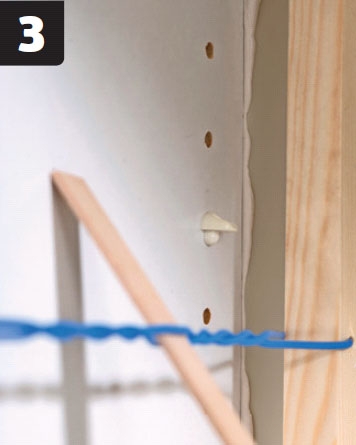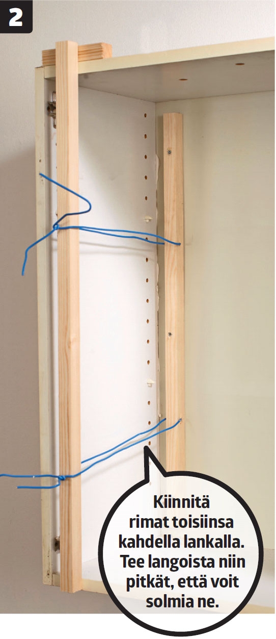Etsi käsiisi sopiva rima, poraa siihen kaksi reikää ja työnnä reikien läpi pyykkinarun tapaista paksua lankaa. Ruuvaa rima kiinni taustalevyyn, mutta varo, ettei rima osu liimaan. Ruu-vien pitää tarttua lujasti kiinni taustalevyyn, joten varmista, että ruuvit ovat tarpeeksi pitkät. Sahaa kaapin etureunaan tukirima, jonka päät yltävät kaapin ylä- ja alareunan päälle.
