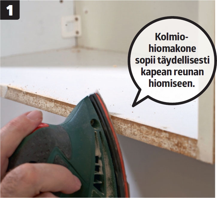 Puhdista kaapin reuna liasta ja vanhan reunanauhan liimasta. Hio reunat tasaisiksi pieni-jyväisellä hiomapaperilla.
