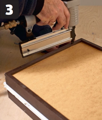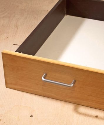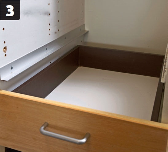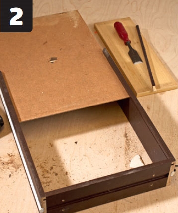 Vedä vanha laatikon pohja pois urasta. Rautakaupoissa myydään toiselta puolelta melamiinilla pinnoitettua puukuitulevyä. Osta sopiva palanen ja piirrä vanhan pohjan mitat uuteen levyyn. Huomioi, että uuden pohja-levyn pitää olla takaa noin kuusi milliä vanhaa pitempi. Sahaa palanen irti levystä ja työnnä se laatikon reunoissa olevaan uraan.