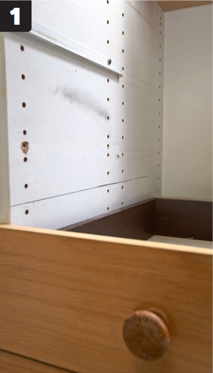 Taustalevyn perusteellinen korjaaminen vaatii koko kaapin purkamisen. Jos purkaminen tuntuu liian isolta urakalta, voit korjata taustalevyn helposti alla näkyvällä tavalla.