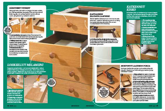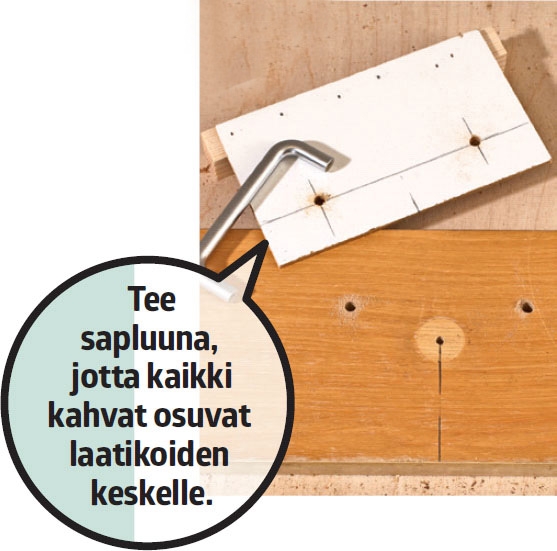 Irrota laatikoiden etureunat ja kahvat. Poraa etureunoihin uudet reiät. Jos vaihdat keittiön kaikki vetimet, tee sapluuna, jotta reiät osuvat varmasti samaan kohtaan joka laatikossa.