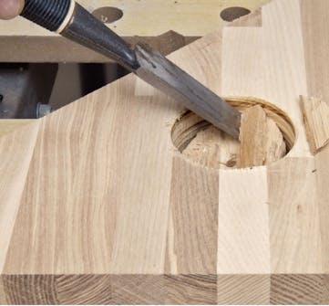 Reikä taltataan auki terävällä taltalla, joka on tarkoitettu puulle. Reiän syvyys mitataan, ja sen pohja tasoitetaan ja puhdistetaan lastuista.