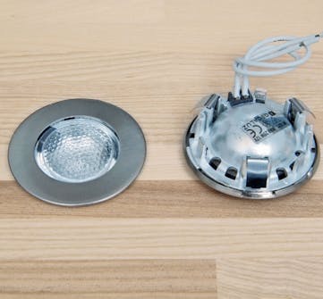 Tarkistamme, sopiiko spotti ensimmäiseen reikään. Sen pitää liukua sisään ilman suurta vastusta, mutta istua kuitenkin napakasti. Jos reikä on hyvä, voit jatkaa muiden reikien tekoa. Oikealla spotti ylhäältä päin kuvattuna.