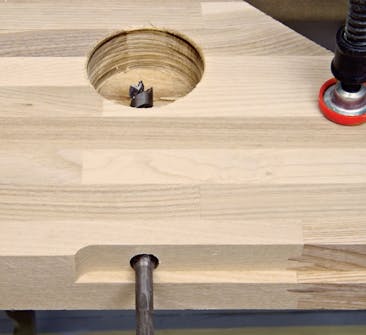 Ensimmäiselle halogeenispotille porataan ensin reikä reikäsahalla. Syvyyden täytyy vastata spottiin merkittyä ohjeistusta. Varo, ettei reikäsahaa ohjaava kärkipiikki mene hyllylevyn läpi.