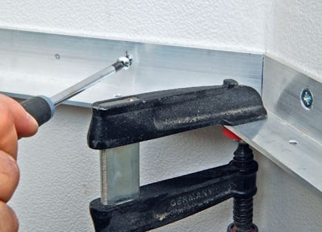 Sekä hyllyt että alumiinikiskot saha-taan puolikulmaan kulmissa. Oikeassa kulmassa 45°:seen, tässä puoleen 135°:sta eli 68,5°:een kulmaan. Pidämme kiskoja yhdessä puristimilla, kun kiinnitämme niitä ruuveilla seinään.