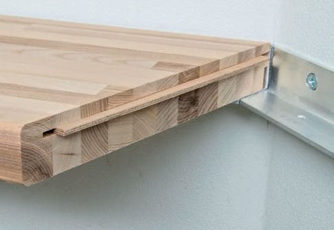 Hyllyt sahataan pöytätason levystä pyörösahalla. Ennen kuin levy nostetaan pukeille, sitä korotetaan ylijäämälistoilla, jotta pyörösahan teräsyvyys voidaan säätää pari millimetriä levypaksuutta suuremmaksi ja sahata niin, että levyä ei tarvitse pidellä.