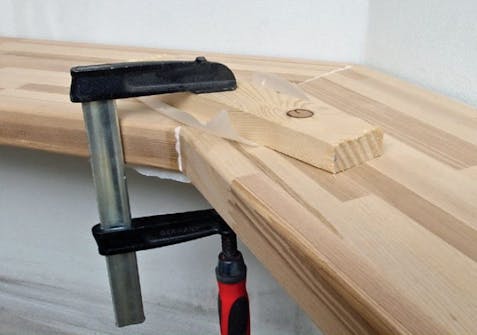 Näin helpolla emme kuitenkaan pääse, sillä hyllyjen alapintaan aiotaan upottaa halogeenispotit, joilla valaistaan työtasoja. Valot olisi helpoin asentaa pinta-asennuksena hyllylevyyn, mutta valitsimme haastavamman ratkaisun ja upotamme lamput ja vedämme kaapelit piiloon. Hyllyt sahataan pöytätasoihin käytetystä levystä: 40 mm:n sauvaliimatusta saarnista. Levystä saa kolme 20 cm leveää hyllyä.