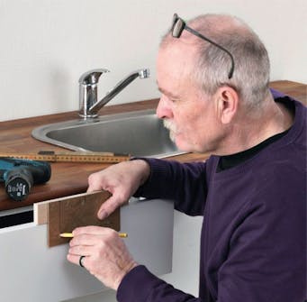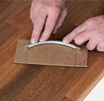 Sahaa kovalevystä tai vanerista sopivan kokoinen pala, esimerkiksi 10 x 20 cm. Levyn kulmien pitää olla täysin suorat. Merkitse levyyn kaksi rinnakkaista viivaa tarkasti vetimien kiinnitysreikien kohdalle.