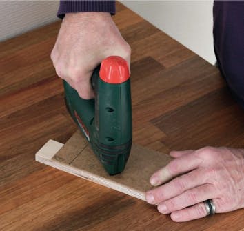 Kiinnitä levyyn listanpätkä niiteillä tai hakasnaulaimella. Lista pitää sijoittaa tarkasti levyn reunan myötäisesti. Listaa käytetään mallin asettamisessa oven tai laatikon reunalinjaan, kun tehdään kiinnitys-merkintöjä. Nyt malli on valmis käyttöön.