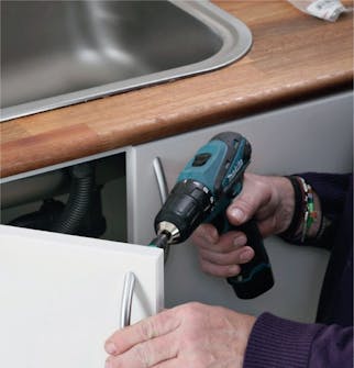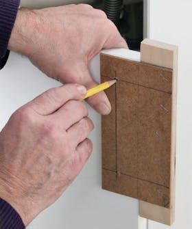 Merkitse mallin avulla vetimien sijainti. Mallia on todella helppo pidellä niin, että se myötäilee oven kulmaa. Nyt voit merkitä porauspaikat lyijykynällä.