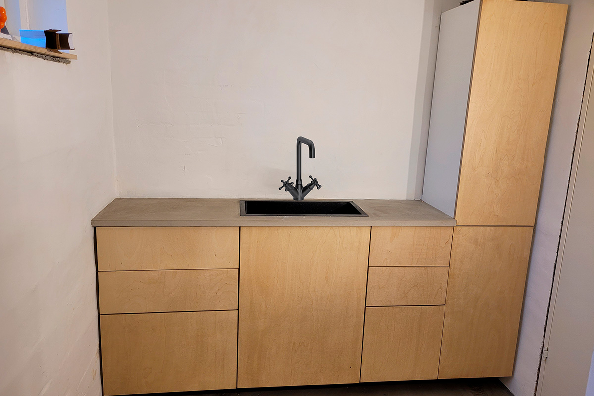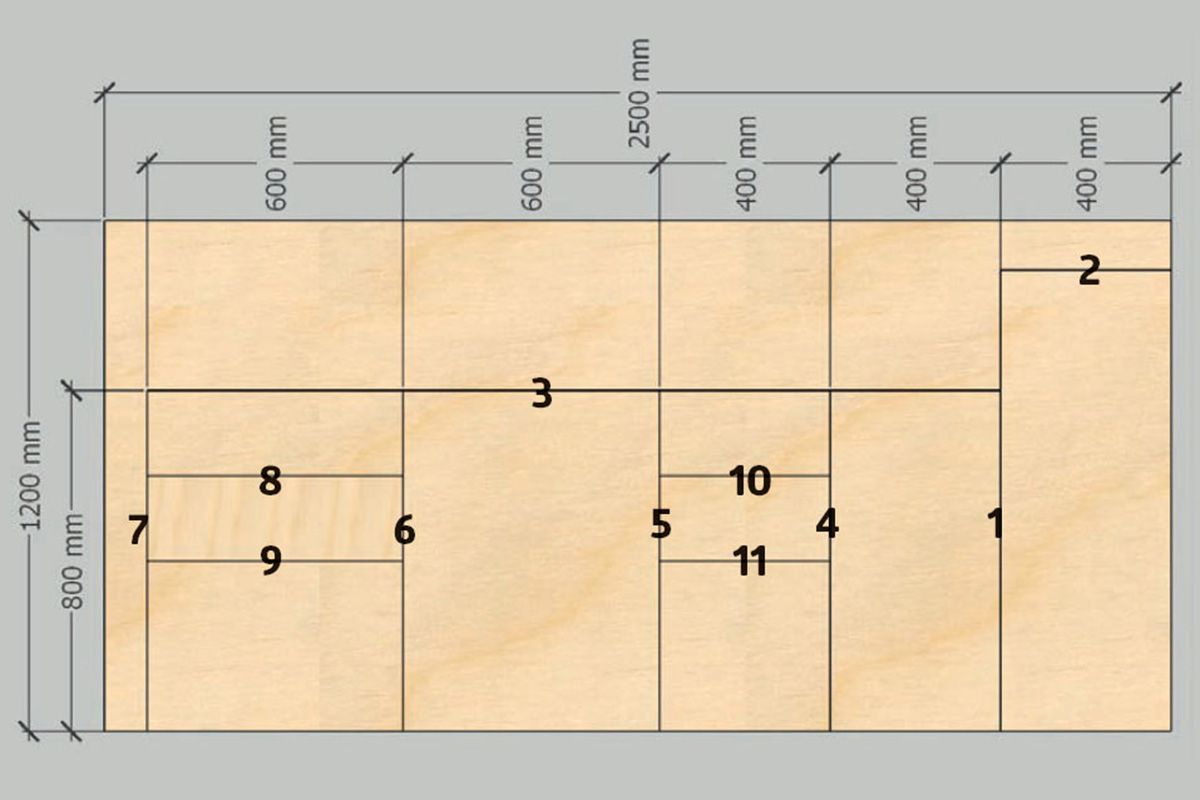 15 milliä paksusta koivuvanerista tehdään ovet kolmelle kaapille ja etulevyt kolmelle laatikolle. Aluksi vaneri tarkistetaan ja päätetään, kummasta puolesta tulee etupuoli. Osat on piirretty jo aiemmin digitaaliseen mallipohjaan, jotta levystä tulee mahdollisimman vähän hukkapaloja.