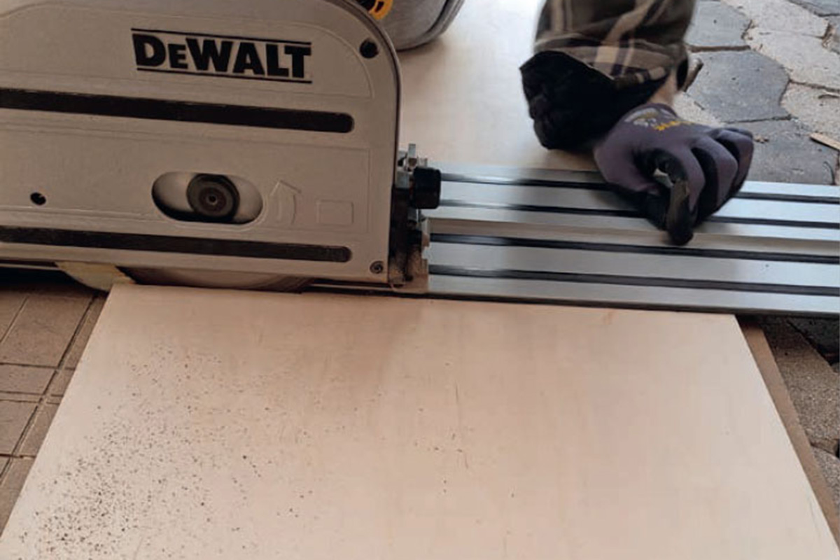 Sahaa levy aluksi poikkisuunnassa. Levy pitää mitata tarkasti, jotta kaikista osista tulee samankokoisia. Kiskon kumireunan pitää olla tarkasti paikallaan. Tässä se tulee 40 sentin päähän reunasta.