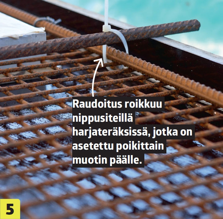 Nosta raudoitusverkko ilmaan. Verkon pitää olla muotin keskellä ja parin sentin päässä reunoista, jotta rautojen päät eivät jää näkyviin.