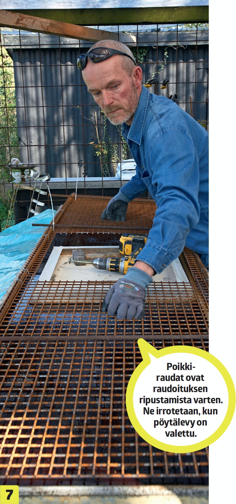 Tämä pöytälevy raudoitetaan teräsverkolla ja harjateräksillä. Betonia voi vahvistaa myös lasikuidulla, mutta se tulee kalliimmaksi.